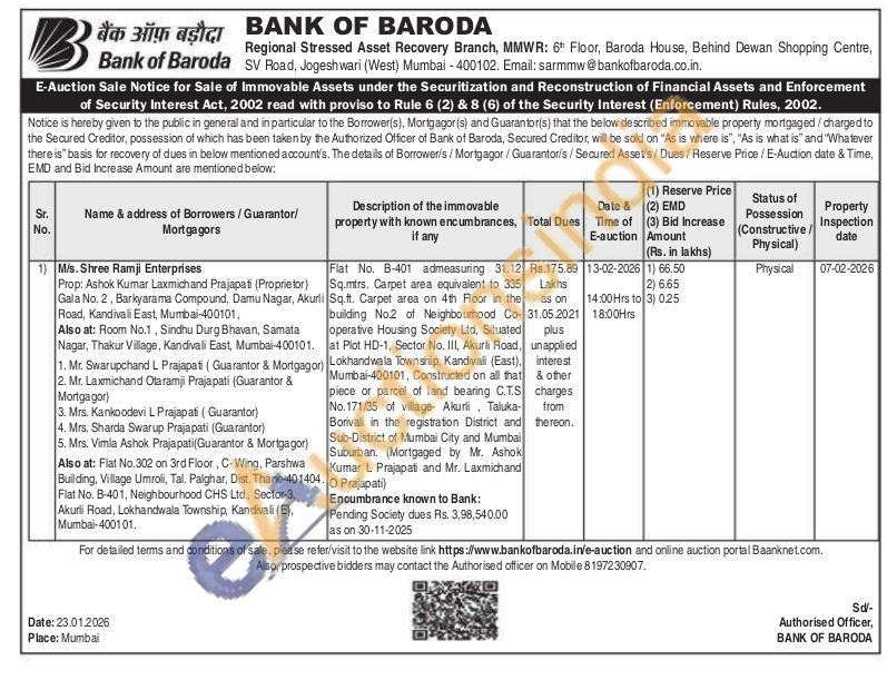 Flat No. B-401 admeasuring 31.12 Sq.mirs. Carpet area equivalent to 335 Sq.ft. Carpet area on 4th Floor in the building No.2 of Neighbourhood Co-operative Housing Society Ltd, Situated at Plot HD-1, Sector No. III, Akurli Road, Lokhandwala Township, Kandivali (East), Mumbai-400101, Constructed on all that piece or parcel of land bearing C.T.S No.171/35 of village Akurli, Taluka-Borivali in the registration District and Sub-District of Mumbai City and Mumbai Suburban. (Mortgaged by Mr. Ashok Kumar L Prajapati and Mr. Laxmichand O Prajapati)