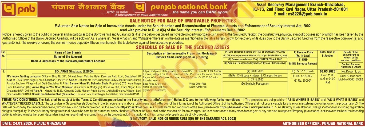 All part and parcel of the property Residential Plot of Khasra No 1623, Ashoka Enclave, Village Loni, Distt Ghaziabad, Uttar Pradesh in the name of Amna Begum W/o Late Shri Noor Mahamad Area 200 SQ Yds. Or 167.22 SQ. mtrs.