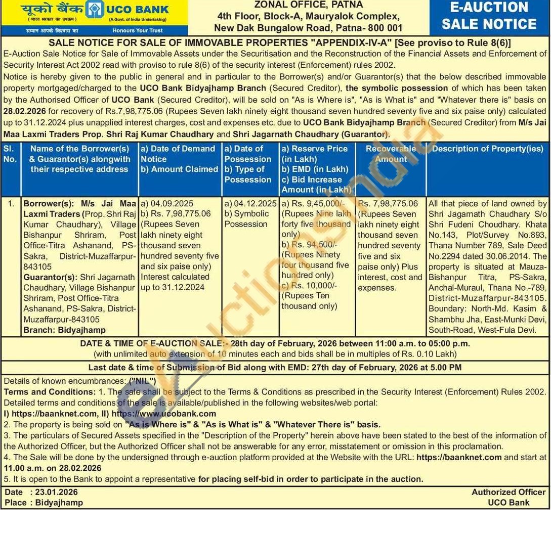 All that piece of land owned by Shri Jagarnath Chaudhary S/o Shri Fudeni Choudhary. Khata No.143, Plot/Survey No.893, Thana Number 789, Sale Deed No.2294 dated 30.06.2014. The property is situated at Mauza-Bishanpur Titra, PS-Sakra, Anchal-Muraul, Thana No.-789, District-Muzaffarpur-843105. Boundary: North-Md. Kasim & Shambhu Jha, East-Munki Devi, South-Road, West-Fula Devi.