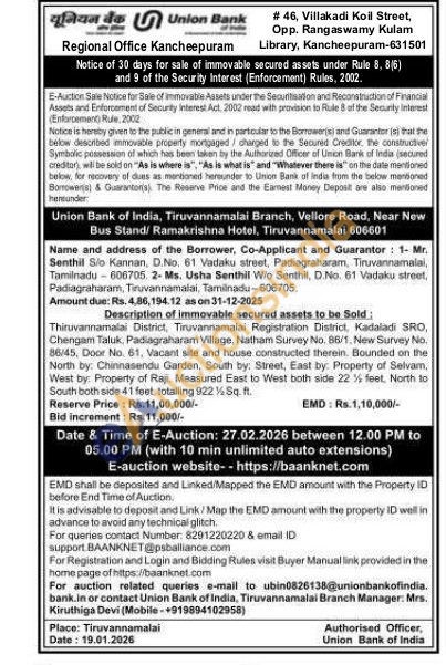 Thituvannamalai District, Tiruvanriamalai Registration District, Kadaladi SRO, Chengam Taluk, Padiagraharam Village, Natham Survey No. 86/1, New Survey No. 86/45, Door No. 61, Vacant site and house constructed therein. Bounded on the North by: Chinnasendu Garden, South by: Street, East by: Property of Selvam, West by: Property of Raji. Measured East to West both side 22 % feet, North to South both side 41 feet, totalling 922 Sq. ft.