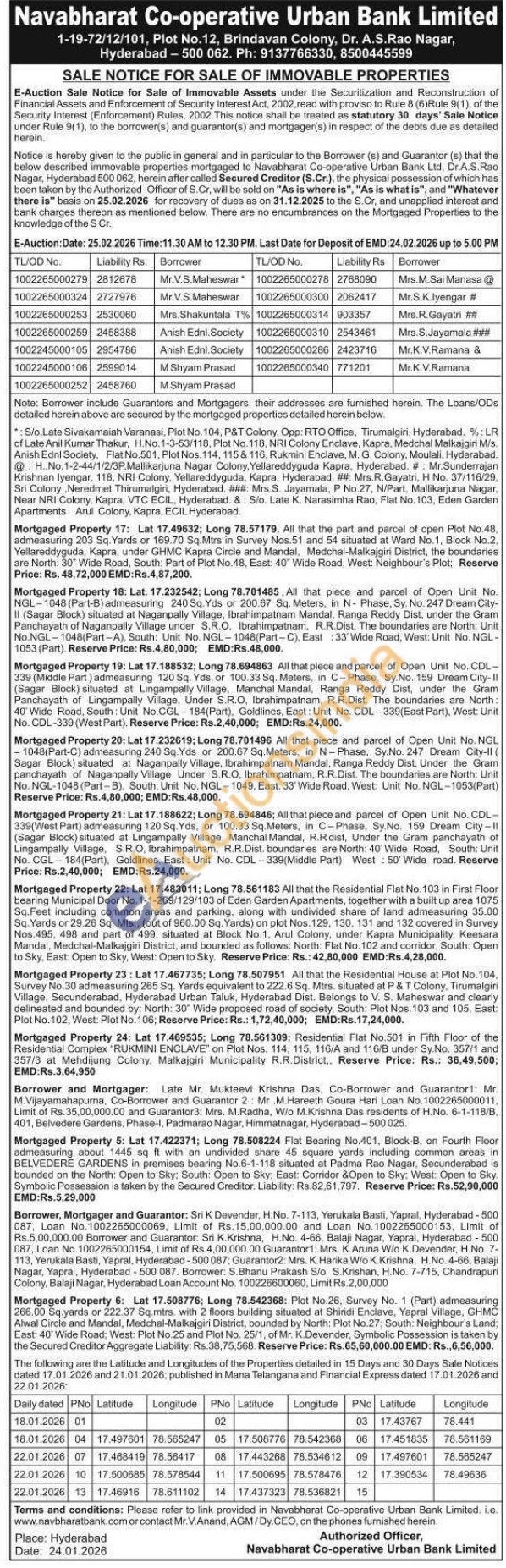 Mortgaged Property 6: Lat 17.508776; Long 78.542368: Plot No.26, Survey No. 1 (Part) admeasuring 266.00 Sq.yards or 222.37 Sq.mtrs. with 2 floors building situated at Shiridi Enclave, Yapral Village, GHMC Alwal Circle and Mandal, Medchal-Malkajgiri District, bounded by North: Plot No.27; South: Neighbour's Land; East: 40° Wide Road, West: Plot No.25 and Plot No. 25/1, of Mr. K.Devender, Symbolic Possession is taken by the Secured Creditor Aggregate Liability: Rs.38,75,568