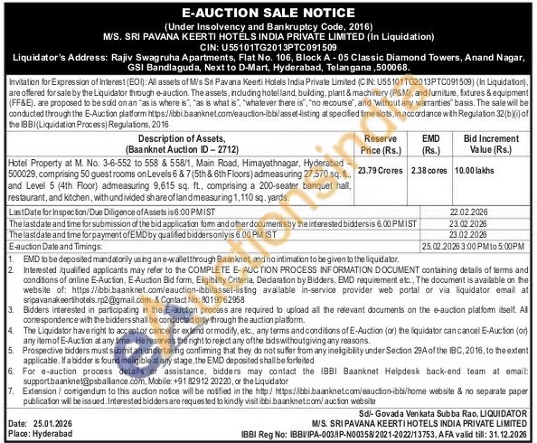 Hotel Property at M. No. 3-6-552 to 558 & 558/1, Main Road, Himayathnagar, Hyderabad -500029, comprising 50 guestrooms on Levels 6 & 7 (5th & 6th Floors) admeasuring 27,570 sq. ft., and Level 5 (4th Floor) admeasuring 9,615 sq. ft., comprising a 200-seater banquet hall, restaurant, and kitchen, with undivided share of land measuring 1,110 sq.yards