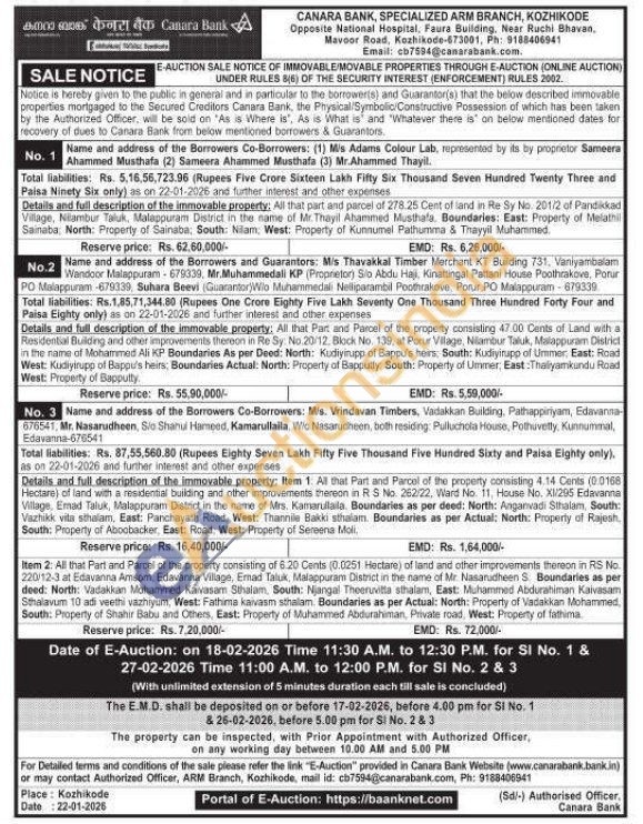 Details and full description of the immovable property: All that part and parcel of 278.25 Cent of land in Re Sy No. 201/2 of Pandikkad Village, Nilambur Taluk, Malappuram District in the name of Mr. Thayil Ahammed Musthafa. Boundaries: East: Property of Melathil Sainaba, North: Property of Sainaba, South: Nilam, West: Property of Kunnumel Pathuntma & Thayyil Muhammed.