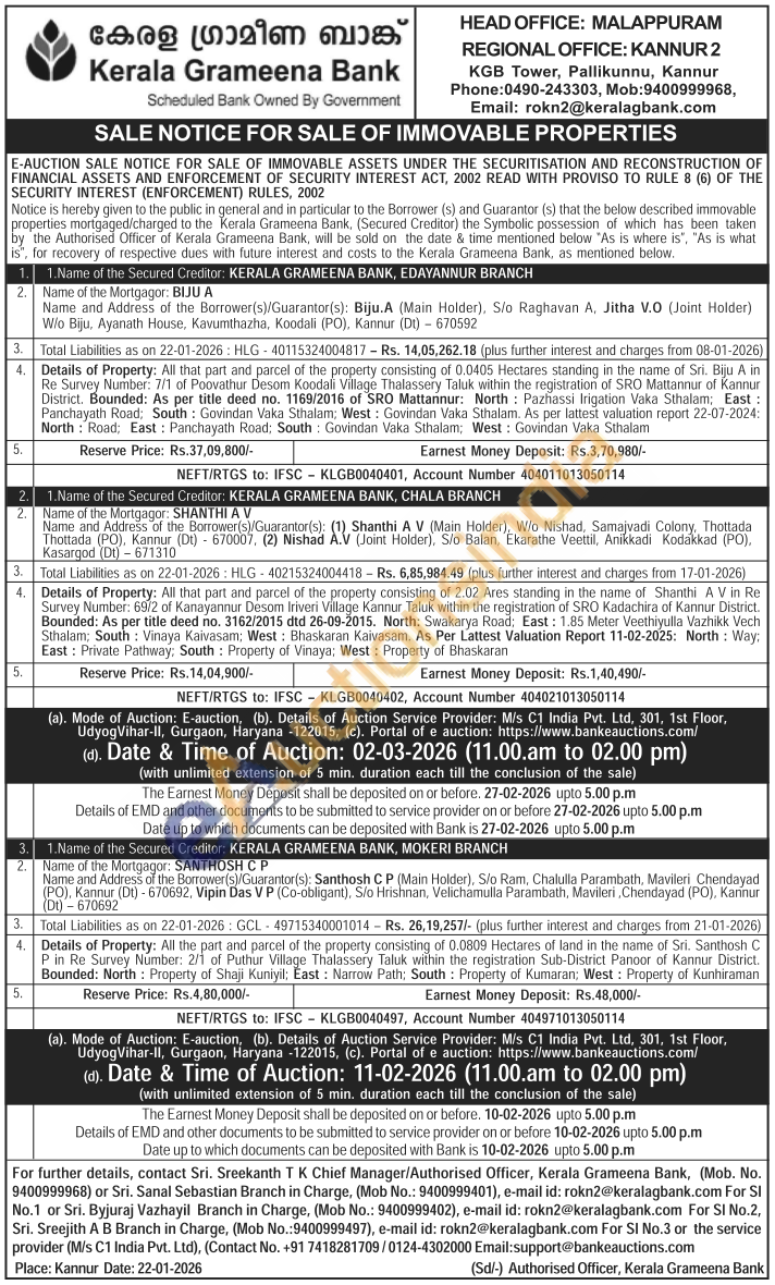 Sri. Sreekanth T K Authorised Officer (Mobile No : 9400999968) / Contact No. +91 7418281709 / 01244302000