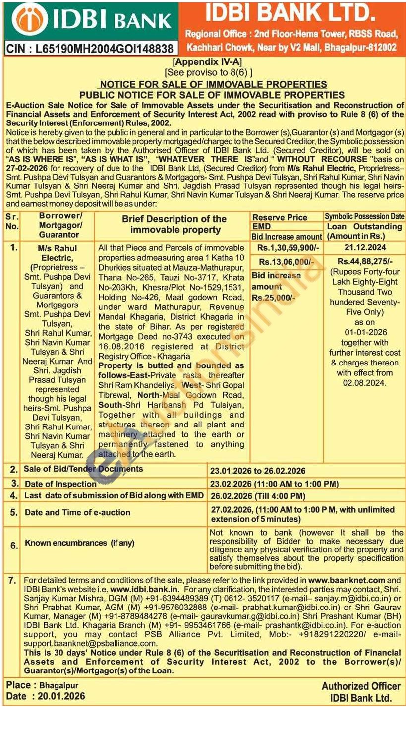 All that Piece and Parcels of immovable properties admeasuring area 1 Katha 10 Dhurkies situated at Mauza-Mathurapur, Thana No-265, Tauzi No-3717, Khata No-203Kh, Khesra/Plot No-1529,1531, Holding No-426, Maal godown Road, under ward Mathurapur, Revenue Mandal Khagaria, District Khagaria in the state of Bihar. As per registered Mortgage Deed no-3743 executed on 16.08.2016 registered at District Registry Office-Khagaria