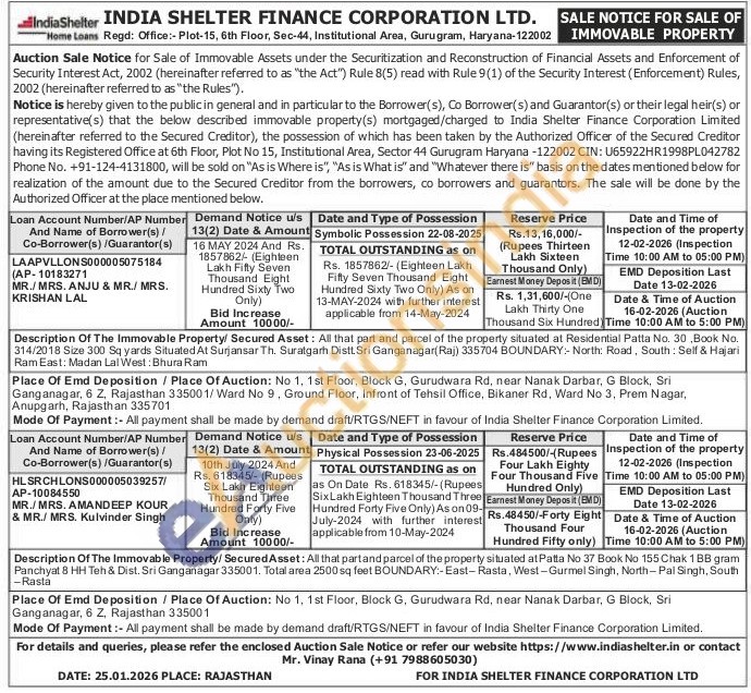 Description Of The Immovable Property/Secured Asset: All that part and parcel of the property situated at Patta No 37 Book No 155 Chak 1 BB gram Panchyat 8 HH Teh & Dist. Sri Ganganagar 335001. Total area 2500 sq feet BOUNDARY:-East-Rasta, West-Gurmel Singh, North-Pal Singh, South -Rasta