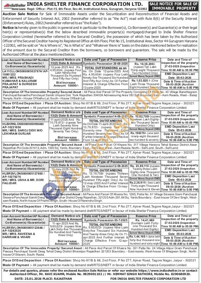 Description Of The Immovable Property/ Secured Asset: All Piece And Parcel Of Khasra No. 317 Village Harsora Tehsil Bansur District Alwar Rajasthan Pin Code 301412, Adm. 1000 Sq. Yards. Boundary East-Self Land, West-Aam Raasta, North-Self Land, South-Self Land