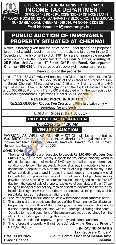Land at T.S. No 68 & 69, Adyar Village, bearing Old No. 19, New No. 15, and Old No.10/2 and New No.19 at Block No.18 at Lock Street and Varadhapuram, 1st Street, Chennai - 85 respectively (a. 15/16 and 1/16 of 1 ground and 649 Sq.ft. of land in T.S.No.68, b. 7/8 of 1 ground and 649 Sq.ft. of land in T.S.No.68 and c. 366.66 Sq.ft of land in T.S.No.69) and situated within the sub-registration District of Adyar and the Registration District of South Chennai