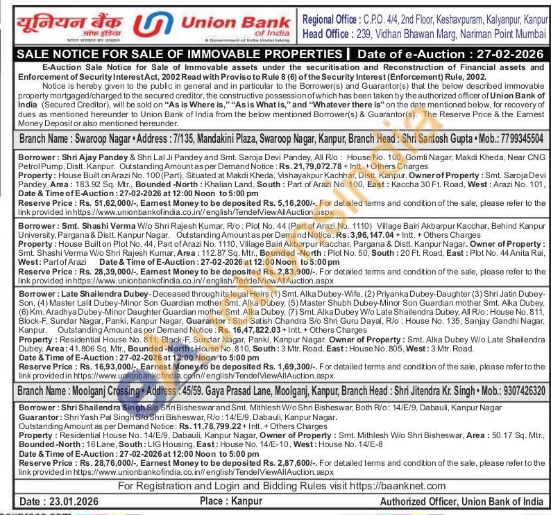 Property: Residential House No. 811, Block-F, Sundar Nagar, Panki, Kanpur Nagar. Owner of Property: Smt. Alka Dubey W/o Late Shailendra Dubey, Area: 41.806 Sq. Mtr., Bounded-North: House No. 810, South: 3 Mtr. Road, East: House No. 805, West: 3 Mtr. Road.