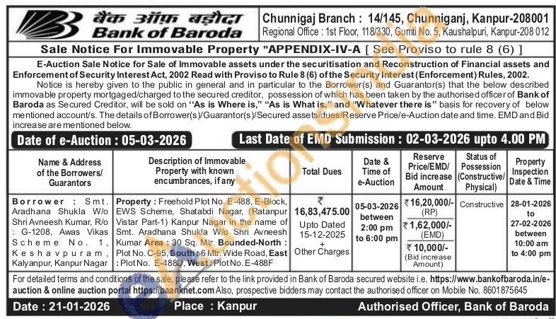 Property: Freehold Plot No. E-488, E-Block, EWS Scheme, Shatabdi Nagar, (Ratanpur Vistar Part-1) Kanpur Nagar in the name of Smt. Aradhana Shukla W/o Shri Avneesh Kumar Area: 30 Sq. Mtr. Bounded-North: Plot No. C-95, South: 6 Mtr. Wide Road, East : Plot No. E-488D, West: Plot No. E-488F