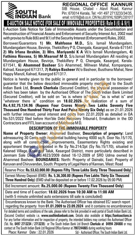 Name of Property Owner: Ahammed Basheer, Description of property: Land admeasuring 30 Cents with residential building having 4000 sq.ft. Door No. 15/170, along with all construction, improvements, Easementary Rights existing and appurtenant thereon comprised in Re Sy No.214/2pt (Sy No.15/170), situated in Kalanad Village, Kasargod Taluk, Kasargod District, more particularly described in Jenmam Sale Deed No.4623/2009 dated 16-12-2009 of SRO Udma owned by Ahammed Basheer. BOUNDARIES: North: Property of Dainabi, East: Property of Karuvan and Chiruvandan, South: Property of Legal Heirs of Kannan, West: Road