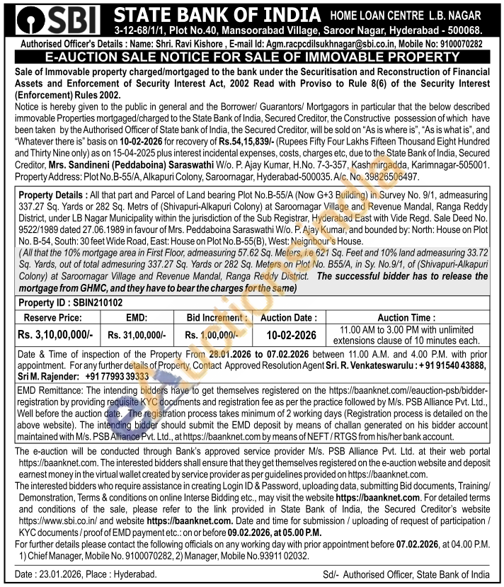Property Details: All that part and Parcel of Land bearing Plot No.B-55/A (Now G+3 Building) in Survey No. 9/1, admeasuring 337.27 Sq. Yards or 282 Sq. Metrs of (Shivapuri-Alkapuri Colony) at Saroornagar Village and Revenue Mandal, Ranga Reddy District, under LB Nagar Municipality within the jurisdiction of the Sub Registrar, Hyderabad East with Vide Regd. Sale Deed No. 9522/1989 dated 27.06.1989 in favour of Mrs. Peddaboina Saraswathi W/o. P. Ajay Kumar, and bounded by: North: House on Plot No. B-54, South: 30 feet Wide Road, East: House on Plot No.B-55(B), West: Neignbour's House.(All that the 10% mortgage area in First Floor, admeasuring 57.62 Sq. Meters, i.e 621 Sq. Feet and 10% land admeasuring 33.72 Sq. Yards, out of total admesuring 337.27 Sq. Yards or 282 Sq. Meters on Plot No. B55/A, in Sy. No.9/1, of (Shivapuri-Alkapuri Colony) at Saroornagar Village and Revenue Mandal, Ranga Reddy District. The successful bidder has to release the mortgage from GHMC, and they have to bear the charges for the same)