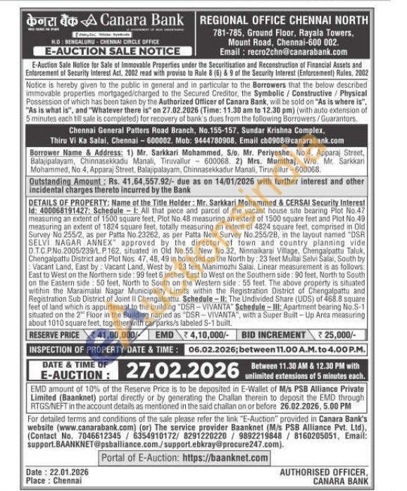 DETAILS OF PROPERTY: Name of the Title Holder: Mr. Sarkkari Mohammed & CERSAL Security Interest Id: 400068191427: Schedule 1: All that piece and parcel of the vacant house site bearing Plot No.47 measuring an extent of 1500 square feet, Plot No.48 measuring an extent of 1500 square feet and Plot No.49 measuring an extent of 1824 square feet, totally measuring an extent of 4824 square feet, comprised in Old Survey No.255/2, as per Patta No.23262, as per Patta New Survey No.255/28, in the layout named "DSR SELVI NAGAR ANNEX approved by the director of town and country planning vide D.T.C.P.No.2005/239/L P162, situated in Old No.55, New No.32, Ninnaikarai Village, Chengalpattu Taluk, Chengalpattu District and Plot Nos. 47, 48, 49 in bounded on the North by: 23 feet Multai Selvi Salai, South by Vacant Land, East by Vacant Land, West by: 23 feet Manimozhi Salai. Linear measurement is as follows: East to West on the Northern side: 99 feet 6 inches East to West on the Southern side: 90 feet, North to South on the Eastern side: 50 feet, North to South on the Western side: 55 feet. The above property is situated within the Maraimalai Nagar Municipality Limits within the Registration District of Chengalpattu and Registration Sub District of Joint II Chengalpattu. Schedule - II: The Undivided Share (UDS) of 468.8 square feet of land which is appurtenant to the building "DSR-VIVANTA" Schedule-III: Apartment bearing No.S-1 situated on the 2 Floor in the Building named as "DSR-VIVANTA", with a Super Built-Up Area measuring about 1010 square feet, together with car parks/s labeled S-1 built.