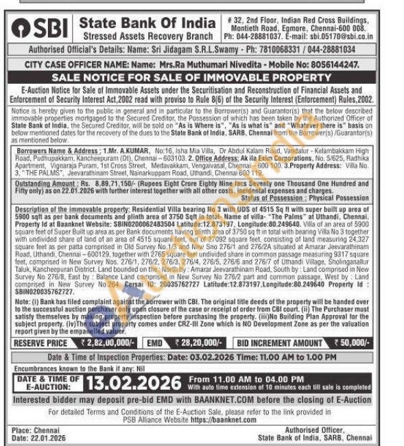 Description of the immovable property: Residential Villa bearing No 3 with UDS of 4515 Sq ft with super built up area of 5900 sqft as per bank documents and plinth area of 3750 Sqft in total- Name of villa "The Palms" at Uthandi, Chennai. Property Id at Baanknet Website: SBIN0200062483504 Latitude: 12.873197, Longitude:80.249640. Villa of an area of 5900 square feet of Super Built up area as per Bank documents having plinth area of 3750 sq ft in total with bearing Villa No 3 together with undivided share of land of an area of 4515 square feet, out of 27092 square feet, consisting of land measuring 24,327 square feet as per patta comprised in Old Survey No. 1/3 and New Sno 276/1 and 276/2A situated at Amarar Jeevarathinam Road, Uthandi, Chennai-600129, together with 2765 square feet undivided share in common passage measuring 9317 square feat, comprised in New Survey Nos. 276/1, 276/2, 276/3, 276/4, 276/5, 276/6 and 278/7 of Uthandi Village, Sholinganallur Taluk, Kancheepuran District. Land bounded on the North by: Amarar Jeevarathinam Road, South by: Land comprised in New Survey No 276/8, East by: Balance Land comprised in New Survey No 276/2 part and common passage, West by Land comprised in New Survey No 264. Cersai ID: 20035762727 Latitude: 12.873197.Longitude:80.249640 Property Id: SBIN020035762727.
