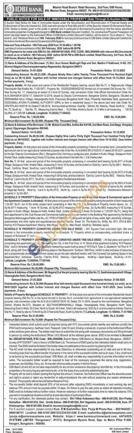 Shri Vithal Koteswara Rao-080-61451250, Shri Pradip Sutradhar-080-61451233, Smt. Urmila Sahoo-080-61451234, Shri Vageesha Javali-080-61451246, Kum. CP Krishnapriya-080-61451280. Email Id: recovery.bangalore@idbi.co.in