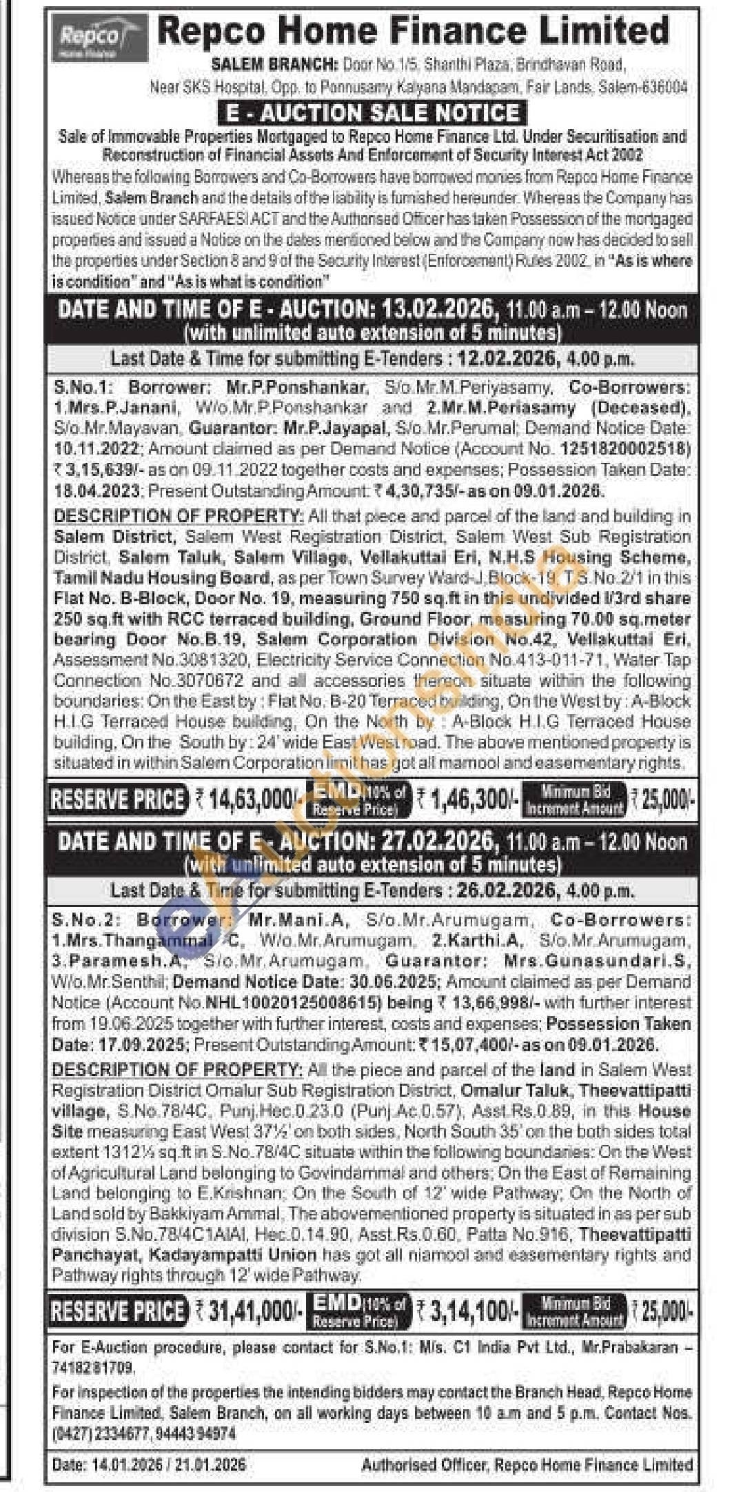 DESCRIPTION OF PROPERTY: All that piece and parcel of the land and building in Salem District, Selem West Registration District, Salem West Sub Registration District, Salem Taluk, Salem Village, Vellakuttai Eri, N.H.S Housing Scheme, Tamil Nadu Housing Board, as per Town Survey Ward-J, Block-19. T.S.No. 2/1 in this Flat No. B-Block, Door No. 19, measuring 750 sq.ft in this undivided 1/3rd share 250 sq.ft with RCC terraced building, Ground Floor, measuring 70.00 sq.meter bearing Door No.8.19, Salem Corporation Division No.42, Vellakuttai Eri, Assessment No.3081320, Electricity Service Connection No.413-011-71, Water Tap Connection No. 3070672 and all accessories thereon situate within the following boundaries: On the East by: Flat No. B-20 Terraced building, On the West by: A-Block H.I.G Terraced House building, On the North by A-Block H.I.G Terraced House building. On the South by: 24 wide East Westroad. The above mentioned property is situated in within Salem Corporation limit has got all mamool and easementary rights.