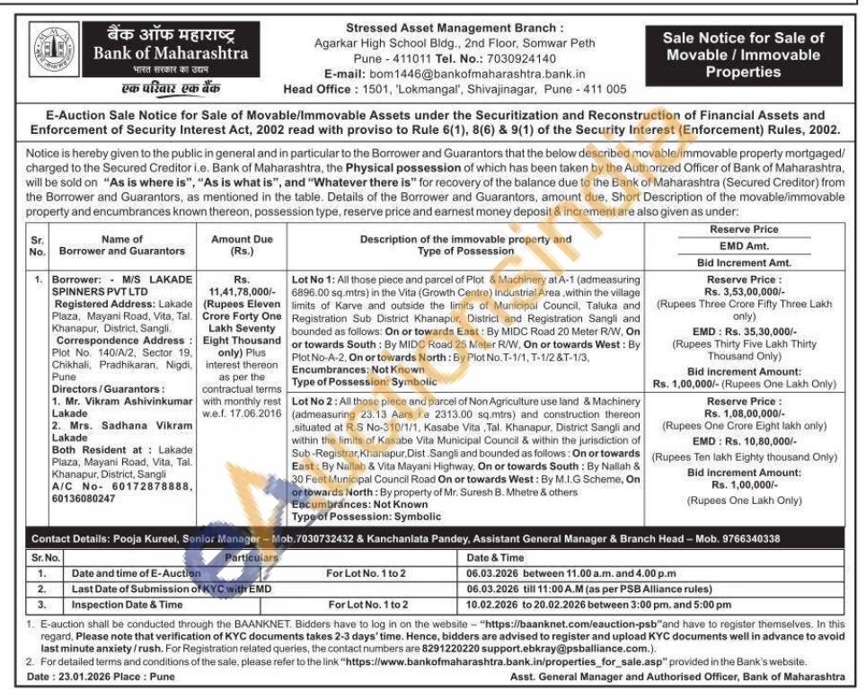 All those piece and parcel of Non Agriculture use land & Machinery (admeasuring 23.13 Aars le 2313.00 sq.mtrs) and construction thereon situated at R.S No-310/1/1, Kasabe Vita, Tal. Khanapur, District Sangli and within the limits of Kasabe Vita Municipal Council & within the jurisdiction of Sub-Registrar, Khanapur Dist Sangli and bounded as follows: On or towards East: By Nallah & Vita Mayani Highway. On or towards South: By Nallah & 30 Feet Municipal Council Road On or towards West: By M.I.G Scheme, On or towards North: By property of Mr. Suresh B. Mhetre & others