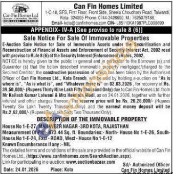 DESCRIPTION OF THE IMMOVABLE PROPERTY : House No 1-E-27, MAHAVEER NAGAR-3RD KOTA, RAJASTHAN Measurement Of Plot-473.44 Sq. ft. Boundaries: North-House No 1-E-26, South-House No 1-E-28, East-ROAD, West House No 1-5-12