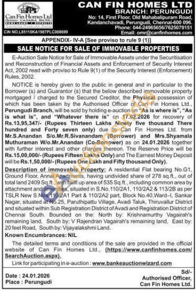Description of immovable Property: A residential Flat bearing No.G1. Ground Floor, Annai Apartments, having undivided share of 278 sq.ft., out of total land 2409 Sq. ft., with built up area of 535 Sq. ft., including common area by attachment and amenities, situated in S.No. 110/2A1, 110/2A2 & 113/28 as per TSLR New S.Nos. 110/2A1 Part & 110/2A2 part, Block No.40,Ward-1, Sankar Nagar, situated at No.25, Paruthipattu Village, Avadi Taluk, Thiruvallur District and situated within Sub Registration District of Avadi and Registration District of Chennai South. Bounded on the North by: Krishnamurthy Vagairah's remaining land, South by: V Rajendran Vagairah's remaining land, East by: 20 feet Road, South by: Vijayalakshmi Land