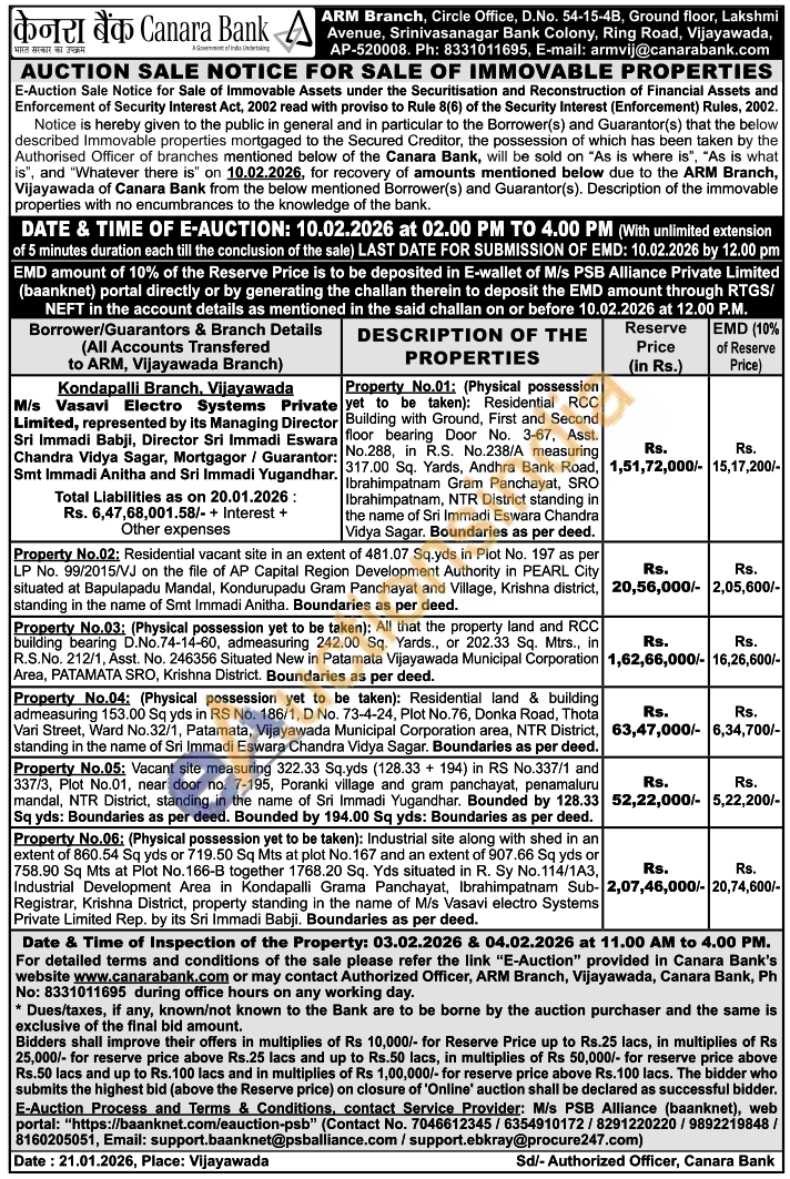 Property No.06; (Physical possession yet to be taken): Industrial site along with shed in an extent of 860.54 Sq yds or 719.50 Sq Mts at plot No. 167 and an extent of 907.66 Sq yds or 758.90 Sq Mts at Plot No. 166-B together 1768.20 Sq. Yds situated in R. Sy No.114/1A3, Industrial Development Area in Kondapalli Grama Panchayat, Ibrahimpatnam Sub-Registrar, Krishna District, property standing in the name of M/s Vasavi electro Systems Private Limited Rep. by its Sri Immadi Babji. Boundaries as per deed