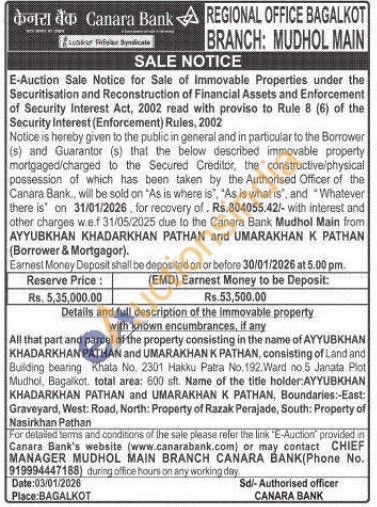 All that part and parcel of the property consisting in the name of AYYUBKHAN KHADARKHAN PATHAN and UMARAKHAN K PATHAN, consisting of Land and Building bearing Khata No. 2301 Hakku Patra No. 192. Ward no.5 Janata Plot Mudhol, Bagalkot. total area: 600 sft. Name of the title holder AYYUBKHAN KHADARKHAN PATHAN and UMARAKHAN K PATHAN, Boundaries:-East: Graveyard, West: Road, North: Property of Razak Perajade, South: Property of Nasirkhan Pathan