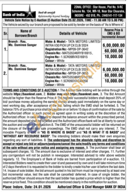 Make & Model:- TATA MOTORS LIMITED/INTRA V30 PICK UP CX CLB/2024 Registration No:-MP09-DP-3655 Chassis No:-MAT535346RYD14150, Engine No:-1.5CR090VXS40058