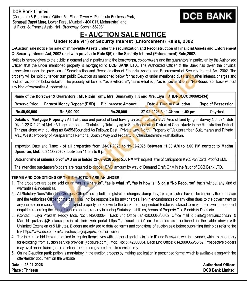 Details of Mortgage Property: All that piece and parcel of land having an extent of total 7.73 Ares of land lying in Survey No. 971, Sub Div-1-22 & 1-21 of Melur Village situated at Chalakkudy Taluk, lying in Sub Registration District of Chalakkudy in the Registration District Thrissur along with building no 6/455&Bounded As Follows: East: Private way, North: Property of Valuparamban Sukumaran and Private Way, West: Property of Paraparambil Rembha, South: Way and Property of Chundanthiruthi Prahaladhan