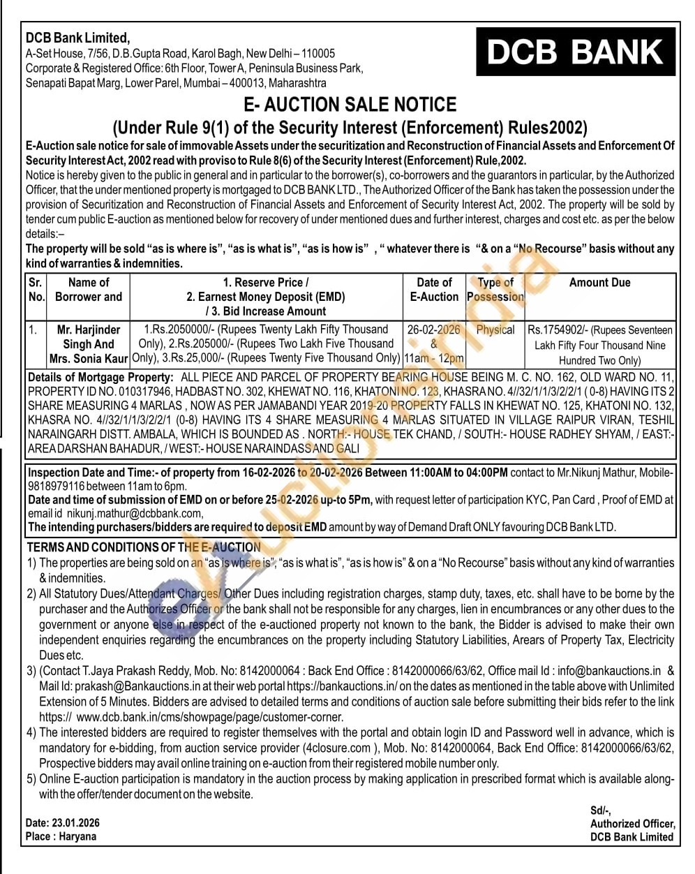Details of Mortgage Property: ALL PIECE AND PARCEL OF PROPERTY BEARING HOUSE BEING M. C. NO. 162, OLD WARD NO. 11, PROPERTY ID NO. 010317946, HADBAST NO. 302, KHEWAT NO. 116, KHATONINO. 123, KHASRANO. 4//32/1/1/3/2/2/1 (0-8) HAVING ITS 2 SHARE MEASURING 4 MARLAS, NOW AS PER JAMABANDI YEAR 2019-20 PROPERTY FALLS IN KHEWAT NO. 125, KHATONI NO. 132, KHASRA NO. 4//32/1/1/3/2/2/1 (0-8) HAVING ITS 4 SHARE MEASURING 4 MARLAS SITUATED IN VILLAGE RAIPUR VIRAN, TESHIL NARAINGARH DISTT. AMBALA, WHICH IS BOUNDED AS. NORTH:- HOUSE TEK CHAND, / SOUTH:- HOUSE RADHEY SHYAM,/EAST:-AREA DARSHAN BAHADUR,/WEST:-HOUSE NARAINDASS AND GALI