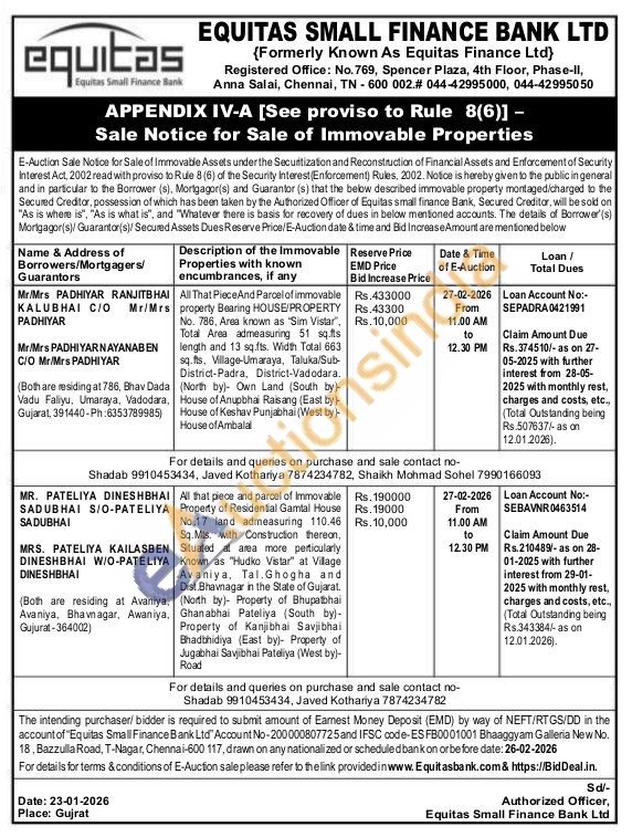 All That PieceAnd Parcel of immovable property Bearing HOUSE/PROPERTY No. 786, Area known as "Sim Vistar", Total Area admeasuring 51 sq.fts length and 13 sq.fts. Width Total 663 sq.fts, Village-Umaraya, Taluka/Sub-District-Padra, District-Vadodara. (North by)- Own Land (South by)-House of Anupbhai Raisang (East by House of Keshav Punjabhai (West by) House of Ambala