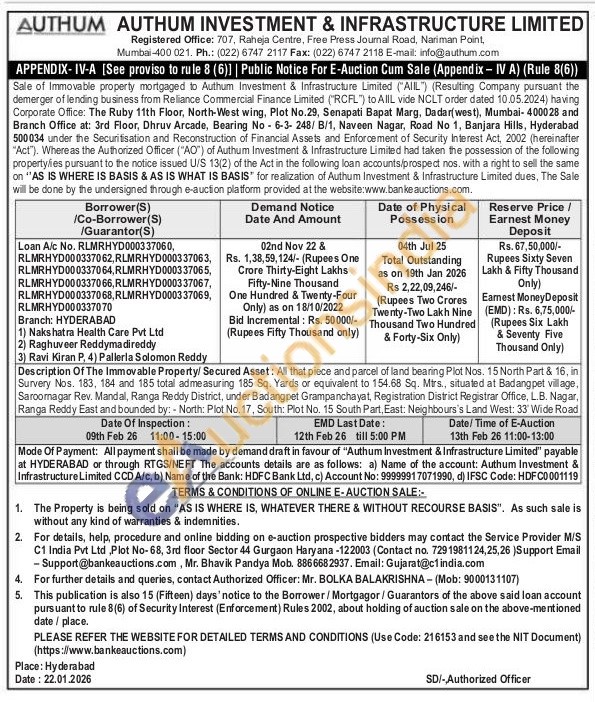 Description Of The Immovable Property/Secured Asset: All that piece and parcel of land bearing Plot Nos. 15 North Part & 16, in Survery Nos. 183, 184 and 185 total admeasuring 185 Sq. Yards or equivalent to 154.68 Sq. Mtrs,, situated at Badangpet village, Saroornagar Rev. Mandal, Ranga Reddy District, under Badangpet Grampanchayat, Registration District Registrar Office, L.B. Nagar, Ranga Reddy East and bounded by:- North: Plot No. 17, South: Plot No. 15 South Part, East: Neighbours's Land West: 33 Wide Road