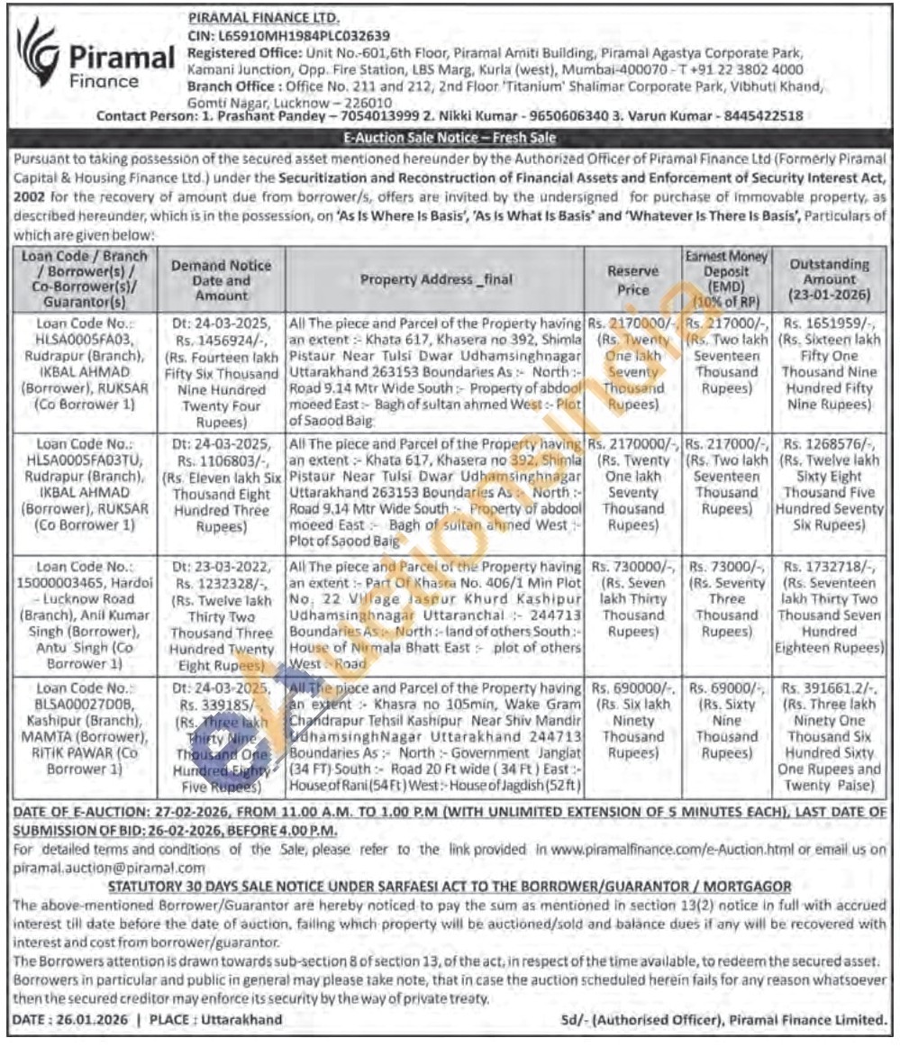 2) All The piece and Parcel of the Property having an extent Khata 617, Khasera no 392, Shimla Pistaur Near Tulsi Dwar Udhamsinghnagar Uttarakhand 263153 Boundaries As: North: Road 9.14 Mtr Wide South Property of abdool moeed East Bagh of sultan ahmed West Plot of Saood Baig