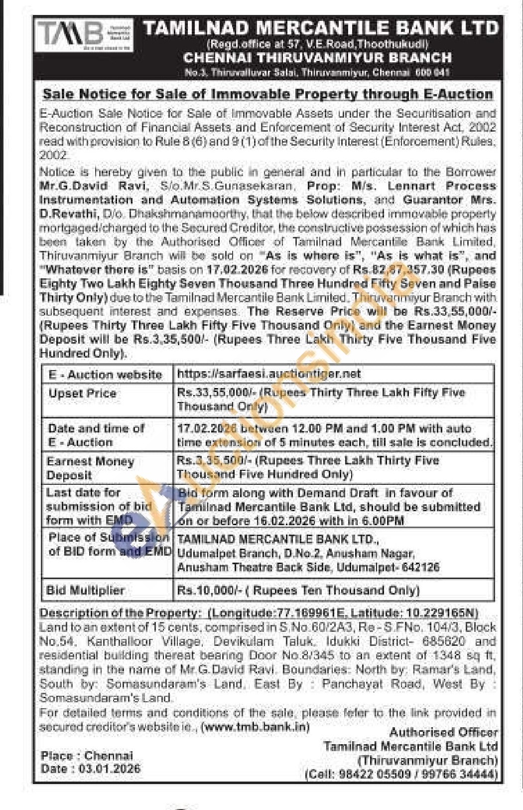 Description of the Property: (Longitude: 77.169961E, Latitude: 10.229165N) Land to an extent of 15 cents, comprised in S. No.60/2A3, Re-S.FNo. 104/3, Black No.54, Kanthalloor Village, Devikulam Taluk, Idukki District- 685620 and residential building thereat bearing Door No.8/345 to an extent of 1348 sq ft, standing in the name of Mr. G. David Ravi. Boundaries: North by: Ramar's Land, South by: Somasundaram's Land, East By Panchayat Road, West By: Somasundaram's Land.