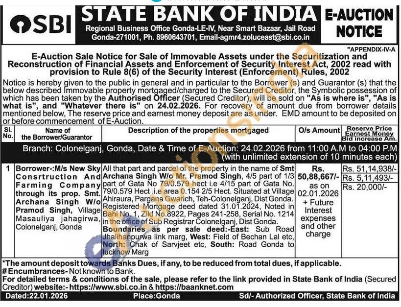All that part and parcel of the property in the name of Smt Archana Singh W/o Mr. Pramod Singh, 4/5 part of 1/3 part of Gata No 79/0.579 hect i.e 4/15 part of Gata No. . 79/0.579 Hect .i.e area 0.154 2/5 Hect. Situated at Village o Ahiraura, Pargana Gwarich, Teh-Colonelganj, Dist Gonda. Registered Mortgage deed dated 31.01.2024, Noted in Bahi No. 1, Zild No.8922, Pages 241-258, Serial No. 1214 in the office of Sub Registrar Colonelganj, Dist Gonda. Boundaries as per sale deed:-East: Sub Road Jhalihanpurwa link marg, West: Field of Bechan Lal etc, North: Chak of Sarvjeet etc, South: Road Gonda to lucknow Marg