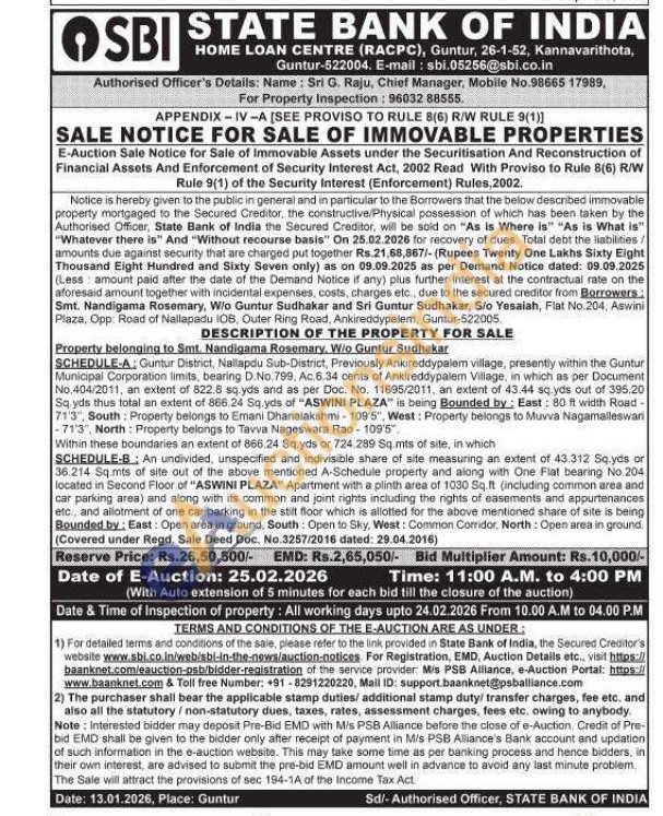 Property belonging to Smt. Nandigama Rosemary, W/o Guntur Sudhakar SCHEDULE-A: Guntur District, Nallapdu Sub-District, Previously Ankireddypalem village, presently within the Guntur Municipal Corporation limits, bearing D.No. 799, Ac.6.34 cents of Ankireddypalem Village, in which as per Document No.404/2011, an extent of 822.8 sq.yds and as per Doc. No. 11695/2011, an extent of 43.44 sq.yds out of 395.20 Sq yds thus total an extent of 866.24 Sq.yds of "ASWINI PLAZA" is being Bounded by: East: 80 ft width Road -71'3", South: Property belongs to Emani Dhanalakshmi-1095", West: Property belongs to Muvva Nagamalleswari -71'3", North: Property belongs to Tavva Nageswara Rao-109'5". Within these boundaries an extent of 866.24 Sq.yds or 724 289 Sq.mts of site, in which SCHEDULE-B: An undivided, unspecified and indivisible share of site measuring an extent of 43.312 Sq.yds or 36.214 Sq.mts of site out of the above mentioned A-Schedule property and along with One Flat bearing No.204. located in Second Floor of "ASWINI PLAZA" Apartment with a plinth area of 1030 Sq.ft (including common area and car parking area) and along with its common and joint rights including the rights of easements and appurtenances etc., and allotment of one car parking in the stilt floor which is allotted for the above mentioned share of site is being Bounded by: East: Open area in ground, South: Open to Sky, West: Common Corridor, North: Open area in ground. (Covered under Regd. Sale Deed Doc. No.3257/2016 dated: 29.04.2016)