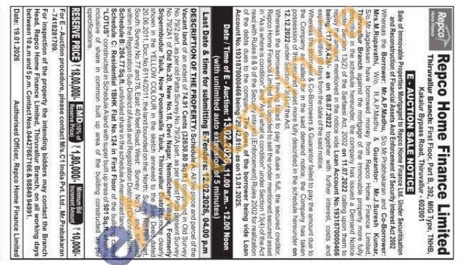 DESCRIPTION OF THE PROPERTY: Schedule A: All the piece and parcel of the Vacant land of an extent of 74.91 Cents (32630.80 Sq.ft.) comprised in Old Survey No. 79/2 part, as per old Patta Survey No. 79/2A part, as per latest Patta present Survey No.79/2A1 of Old No.20, New No.18, Devi Nagar, Nemilichery Village, Formerly Sripermbudur Taluk, Now Poonamalle Taluk, Thiruvallur District, more clearly shown in the YELLOW COLOUR in the sketch annexed to the Sale Deed dated 20.06.2011, Doc. No.6114/2011, the land bounded on the: North: Survey No.79/1 part South: Survey No. 77 and 78, East: 40 feet Road, West: Survey No.73, and situated within the Registration Sub-District of Avadi and Registration District of Chennai North. Schedule B: 204.77 Sq.ft. undivided share in the schedule A mentioned land. Schedule C: Residential 18HK Flat No.124 in First Floor of the building called "LOTUS" constructed in Schedule A land with super built up area of 501 Sq.ft. which is inclusive of share in common built up area of the building constructed as per specifications.