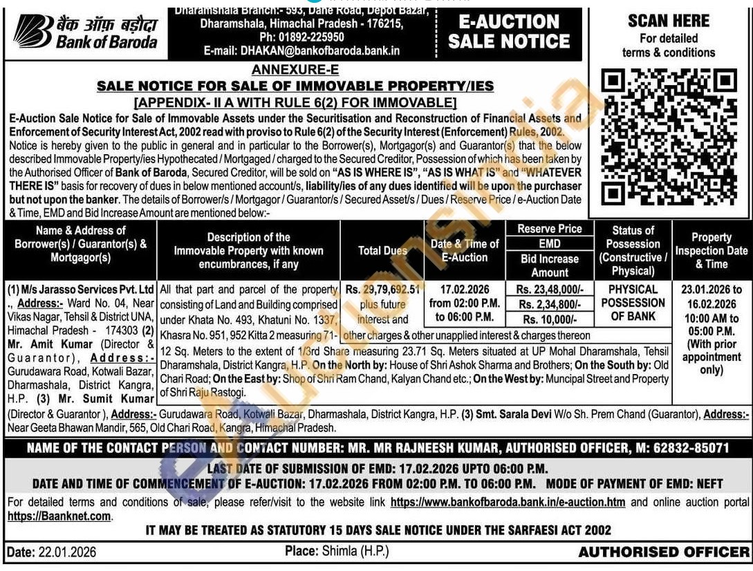 All that part and parcel of the property consisting of Land and Building comprised under Khata No. 493, Khatuni No. 1337 Khasra No. 951, 952 Kitta 2 measuring 71- 12 Sq. Meters to the extent of 1/3rd Share measuring 23.71 Sq. Meters situated at UP Mohal Dharamshala, Tehsil Dharamshala, District Kangra, H.P. On the North by: House of Shri Ashok Sharma and Brothers; On the South by: Old Chari Road; On the East by: Shop of Shri Ram Chand, Kalyan Chand etc.; On the West by: Muncipal Street and Property of Shri Raju Rastogi