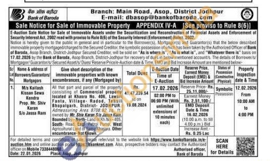 All that part and parcel of the property consisting of Commercial properly located at Khaara No. 406, Lawari Fanta, Village Radod. Tehsil Bhopalgarh, District- JODHPUR Admeasuring Area 8708.82 sq. owned by Mr. Shiv Karan Sio Jassa Ram Bounded by:-North-Land of Kh No-405 South Road, East: Petrol Pump. West Agricultural Land of Same Khasara Other encumbrance-Not Known