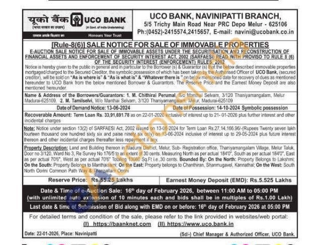 Property Description: Land and Building thereon in Madurai District, Melur, Sub-Registration office, Thaniyamangalam Village, Melur Taluk Door no 3/120, Ward No 3, Re Survey No 176/5 to an extent of 30 cents. Measuring North as per actual 1840", South as per actual 184", East as per actual 7016", West as per actual 7016" Totaling 13080 Sq.Ft ie 30 cents. Bounded By: On the North: Property Belongs to Lakshm On the South: Property Belongs to Manthasami: On the East: Property belongs to Chanthiran, Shanmugavel, Kannathal, On the West: South North Corini Common Path Way & Thenpallam Oorini