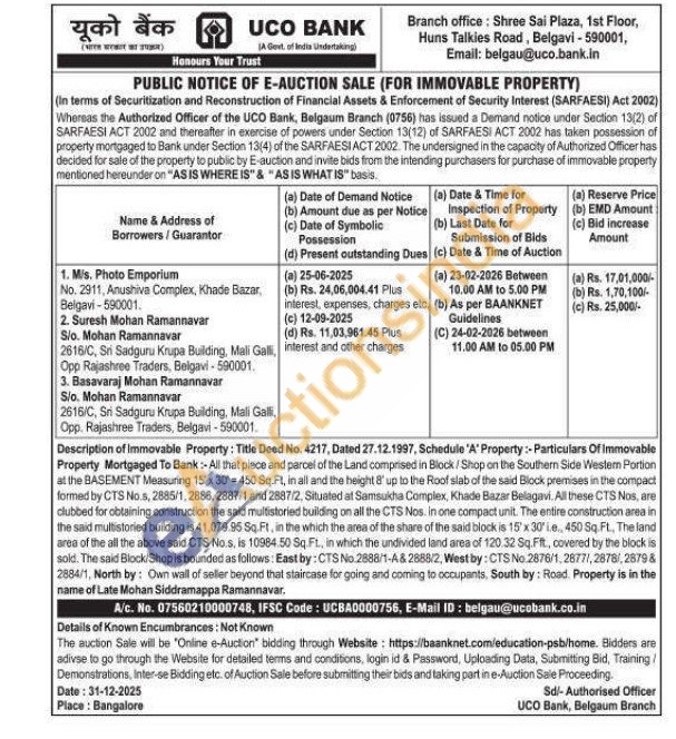Description of Immovable Property: Title Deed No. 4217, Dated 27.12.1997, Schedule 'A' Property: Particulars Of Immovable Property Mortgaged To Bank: All that piece and parcel of the Land comprised in Block/Shop on the Southern Side Westem Portion at the BASEMENT Measuring 15 x 30-450 Sq. Ft, in all and the height 8' up to the Roof slab of the said Block premises in the compact formed by CTS No. s, 2885/1, 2886, 2887/1 and 2887/2, Situated at Samsukha Complex, Khade Bazar Belagavi. All these CTS Nos, are clubbed for obtaining construction the said multistoried building on all the CTS Nos. In one compact unit. The entire construction area in the said multistoried building is 41,079.95 Sq. Ft, in the which the area of the share of the said block is 15' x 30'le, 450 Sq. Ft., The land area of the all the above said CTS No.s, is 10984.50 Sq Ft, in which the undivided land area of 120.32 Sq. Fift., covered by the block is sold. The said Block/Shop is bounded as follows: East by: CTS No.2888/1-A& 2888/2, West by: CTS No 2876/1, 28771, 2878/,2879& 2884/1, North by: Own wall of seller beyond that staircase for going and coming to occupants, South by: Road. Property is in the name of Late Mohan Siddramappa Ramannavar.