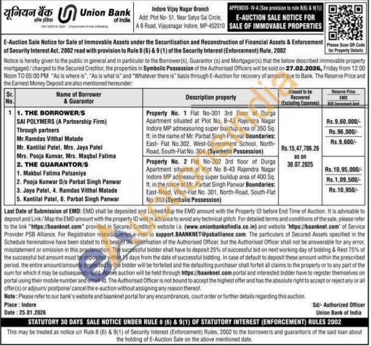 Property No. 2 Flat No-302 3rd floor of Durga Apartment situated at Plot No B-43 Rajendra Nagar Indore MP admeasuring super buildup area of 400 Sq. ft. in the name of Mr. Parbat Singh Panwar Boundaries: East-Road, West-Flat No. 301, North-Road, South-Flat No. 303