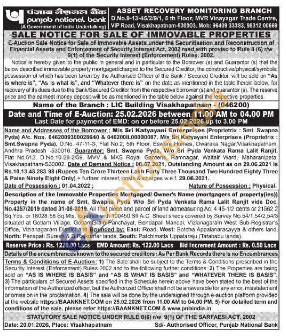Description of the Immovable Properties Mortgaged/ Owner's Name (mortgagers of property(ies)) Property in the name of Smt. Swapna Pyda W/o Sri Pyda Venkata Rama Lalit Ranjit vide Doc. No.4357/2019 dated 31-08-2019. All that piece and parcel of land admeasuring Ac. 4.45-1/2 cents or 21562.2 Sq. Yds or 18028.58 Sq.Mts. together with 100450 Sft.A.C. Sheet sheds covered by Survey No.54/1,54/2,54/3 situated at Gotiam Village, GotiamGram Panchayat, Bondapali Mandal, Vizianagaram West Sub-Registrar's Office, Vizianagaram District and Bounded by: East: Road, West: Botcha Appalanarasayya & others land, North: Penapati Suresh & D. Rajkumar lands, South: Patchimatla Uppalaraju (Tatababu lands).