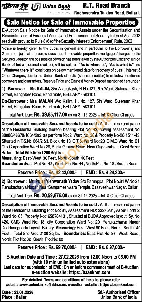 Description of Immovable Secured Assets to be sold: All that piece and parcel of the Residential Building thereon bearing Plot No: 43, having assessment No: 38088/46678/1064/2a3, as per form No: 2, Ward No: 28 & Property No-28-1511-43, Situated in T.S.N:1064/2 &3, Block No:13, C.T.S. Ward No: 20, C.M.C Ward No: 21, City Corporation Ward No.26, Burial Ground Road, Near Guggarahatti, Cowl Bazar, Ballari. Total Site Area 1200 Sq fts.