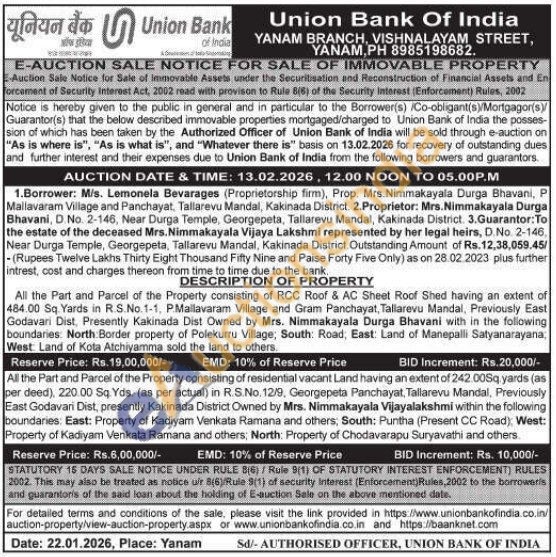 DESCRIPTION OF PROPERTY : All the Part and Parcel of the Property consisting of RCC Roof & AC Sheet Roof Shed having an extent of 484.00 Sq. Yards in R.S.No.1-1, P.Mallavaram Village and Gram Panchayat, Tallarevu Mandal, Previously East Godavari Dist, Presently Kakinada Dist Owned by Mrs. Nimmakayala Durga Bhavani with in the following boundaries: North Border property of Polekurru Village; South: Road, East: Land of Manepalli Satyanarayana, West: Land of Kota Atchiyamma sold the land to others