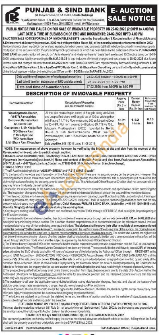 All that site measuring an extent of 5 sq yds being undivided and unspecified share in 65 sq yds out of 130 sq yds together with Flat no T 1, Third Floor measuring 500 sq ft bearing Door no 30-4-9/4, Plot no 1, covered by Block no 29, TS No 706,. Alipuram, Visakhapatnam 530020 bounded by North: House of Eati Narasimhanaidu West: Wall of Premasamajam, East: 25 feet road, South: house of Botta Chinnayya Sale deed No. 6081/2016 dated 31-08-2016