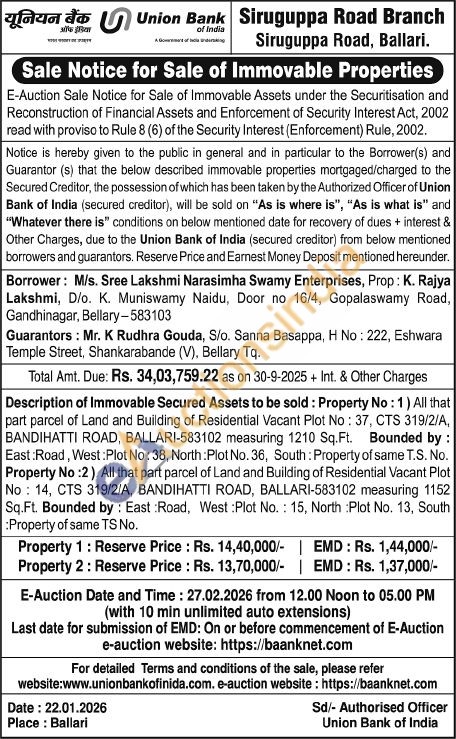 Description of Immovable Secured Assets to be sold: Property No: 1) All that part parcel of Land and Building of Residential Vacant Plot No: 37, CTS 319/2/A, BANDIHATTI ROAD, BALLARI-583102 measuring 1210 Sq. Ft. Bounded by: East:Road, West: Plot No: 38, North: Plot No. 36, South: Property of same T.S. No