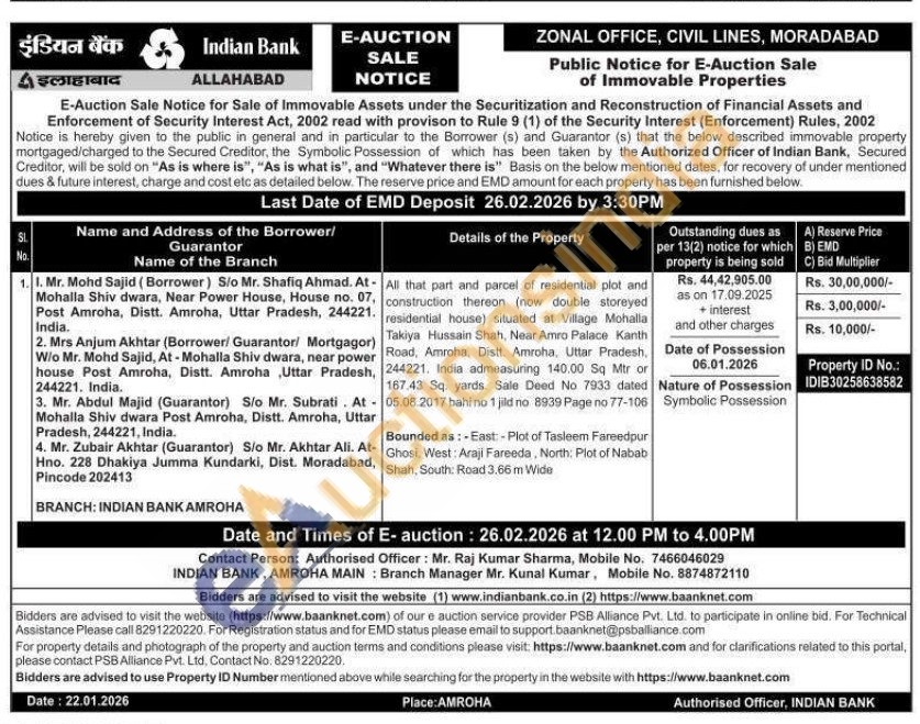 All that part and parcel of residential plot and construction thereon (now double storeyed residential house) situated at Village Mohalla Takiya Hussain Shah, Near Amro Palace Kanth Road, Amroha, Distt. Amroha, Uttar Pradesh, 244221. India admeasuring 140.00 Sq Mtr or 167.43 Sq. yards. Sale Deed No 7933 dated 05.08.2017 bahi no 1 jild no 8939 Page no 77-106 Bounded as: East-Plot of Tasleem Fareedpur Ghosi, West: Araji Fareeda, North: Plot of Nabab Shah, South: Road 3.66 m Wide