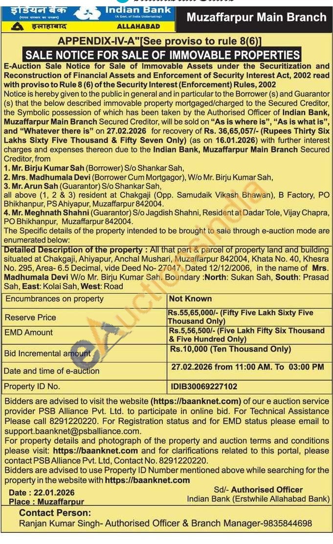 Detailed Description of the property: All that part & parcel of property land and building situated at Chakgaji, Ahiyapur, Anchal Mushari, Muzaffarpur 842004, Khata No. 40, Khesra No. 295, Area- 6.5 Decimal, vide Deed No-27047, Dated 12/12/2006, in the name of Mrs. Madhumala Devi W/o Mr. Birju Kumar Sah. Boundary:North: Sukan Sah, South: Prasad Sah, East: Kolai Sah, West: Road