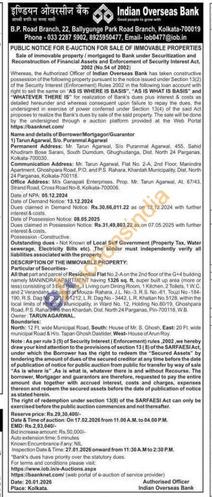 Particular of Securities- All that part and parcel of Residential Flat No.2-A on the 2nd floor of the G+4 building namely MANINDRA APARTMENT having 1326 sq. ft. super built up area (more or less) consisting of 3 Bed Room, 1 Living cum Dining Room, 1 Kitchen, 2 Toilets, 1 W.C. and 2 Verandahs, Situated at Mouza- Rahara, J.L. No-3, R.S. No.-61, Touzi No-184-190, R.S. Dag No-1211 & 1212, L.R. Dag No.-3442, L.R. Khatian No.5128, within the local limits of Khardah Municipality, in Ward No. 12, Holding No.80/19, Ghoshpara Road, P.S. Rahara the then Khardah, Dist. North 24 Parganas, Pin-700118, W.B Owner: TARUN AGARWAL Boundaries: North: 12 FL wide Municipal Road, South: House of Mr. S. Ghosh, East: 20 Ft. wide municipal Road & Hio. Tapan Ghosh Dastider, West-House of Arun Roy