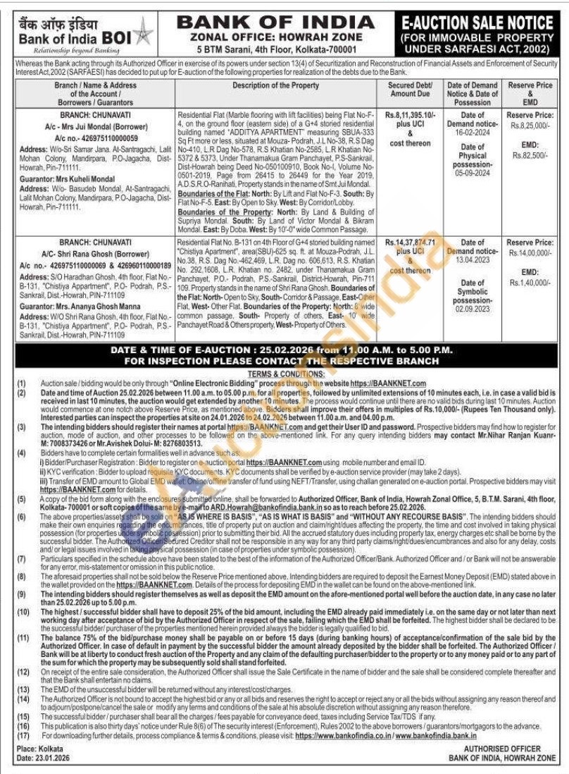 Residential Flat No 8-131 on 4th Floor of G+4 storied building named "Chistiya Apartment", area(SBU)-625 sq. ft. at Mouza-Podrah, JL No.38. R.S. Dag No.-462.469, LR. Dag no. 606,613, R.S. Khatian No. 292.1608, LR Khatian no. 2482. under Thanamakua Gram Panchayet, PO- Podrah, PS-Sankrail, District-Howrah, Pin-711 109. Property stands in the name of Shri Rana Ghosh, Boundaries of the Flat: North-Open to Sky, South-Corridor & Passage, East-Other Flat. West-Other Flat. Boundaries of the Property: North: 8 wide common passage. South Propery of others. East 10 wide Panchayet Road & Others property, West-Property of Others