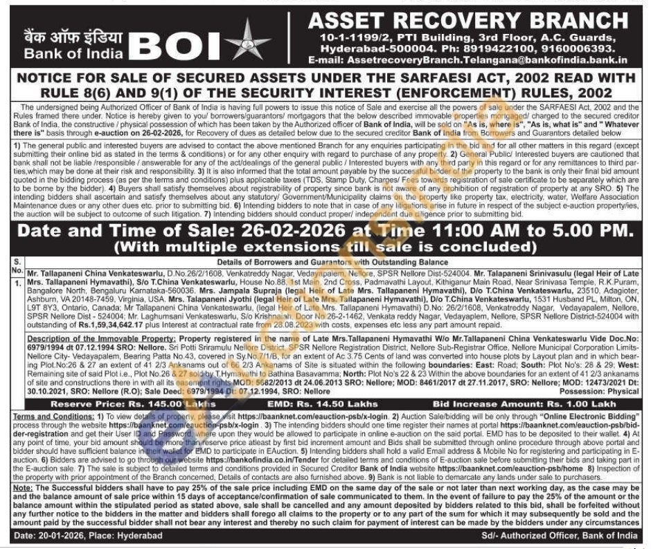 Description of the Immovable Property: Property registered in the name of Late Mrs. Tallapaneni Hymavathi W/o Mr.Tallapaneni China Venkateswarlu Vide Doc.No: 6979/1994 dt 07.12.1994 SRO: Nellore. Sri Potti Sriramulu Nellore District, SPSR Nellore Registration District, Nellore Sub-Registrar Office, Nellore Municipal Corporation Limits-Nellore City- Vedayapalem, Bearing Patta No.43, covered in Sy. No. 7/1/B, for an extent of Ac 3.75 Cents of land was converted into house plots by Layout plan and in which bear-ing Plot. No:26 & 27 an extent of 41 2/3 Ankanams out of 66 2/3 Ankanams of Site is situated within the following boundaries: East: Road, South: Plot No's: 28 & 29, West: Remaining site of said Plot i.e., Plot No.26 & 27 sold by T.Hymavathi to Bathina Basavamma; North: Plot No's 22 & 23 Within the above boundaries for an extent of 41 2/3 ankanams of site and constructions there in with all its easement rights MOD: 5682/2013 dt 24.06.2013 SRO: Nellore; MOD: 8461/2017 dt 27.11.2017, SRO: Nellore; MOD: 12473/2021 Dt: 30.10.2021, SRO: Nellore (R.O); Sale Deed: 6979/1994 Dt: 07.12.1994, SRO: Nellore